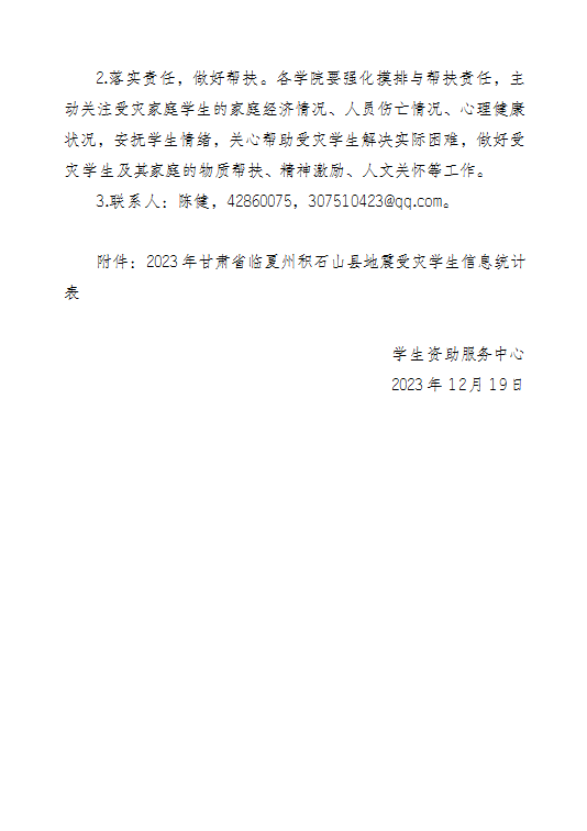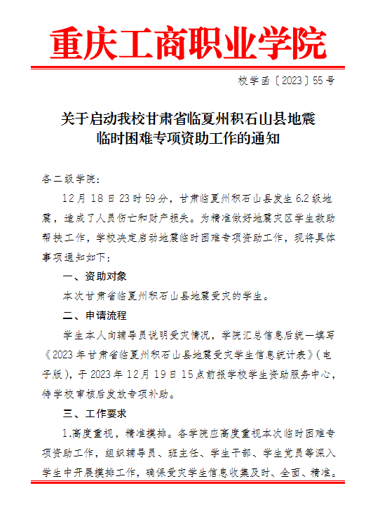 【资助政策】关于启动我校甘肃省临夏州积石山县地震临时困难专项资助工作的通知