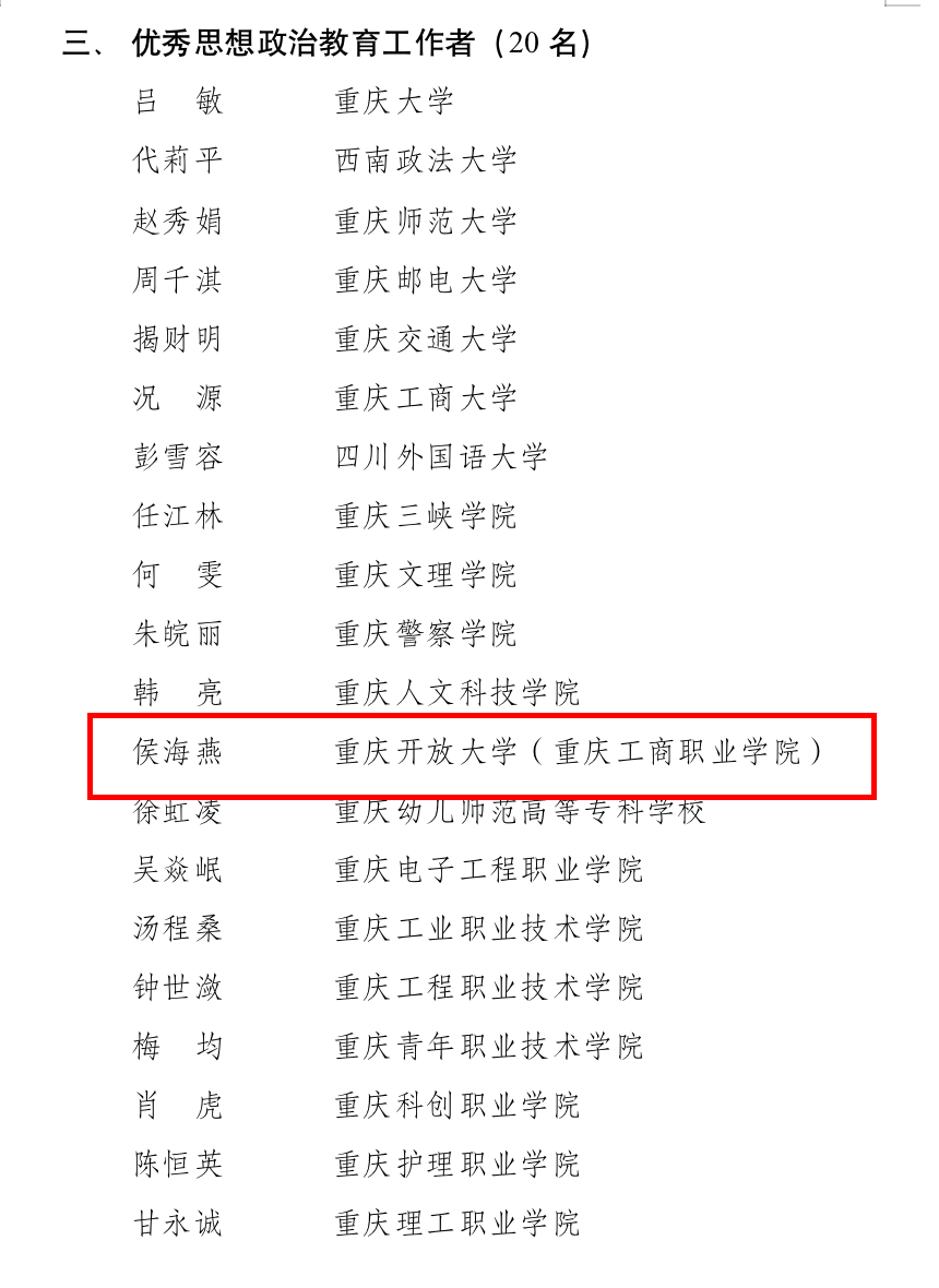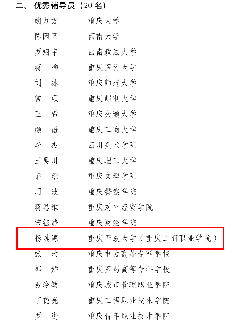 近日,中共重庆市委教育工作委员会公布了“2021年度重庆高校辅导员年度人物、优秀辅导员和优秀思想政治教育工作者”名单。我校传媒与设计学院辅导员杨琪源荣获2021年度重庆市高校“优秀辅导员”荣誉称号,党委宣传部侯海燕荣获2021年度重庆市高校“优秀思想政治教育工作者”荣誉称号。