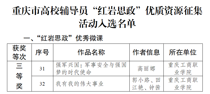 近日,重庆市教委公布了高校辅导员“红岩思政”优质资源征集活动评选结果。我校辅导员高丽娜作品《强军兴国:军事安全与强国梦的时代使命》、郭小路等作品《我有我的伟大事业》均获“红岩思政”优秀微课三等奖。