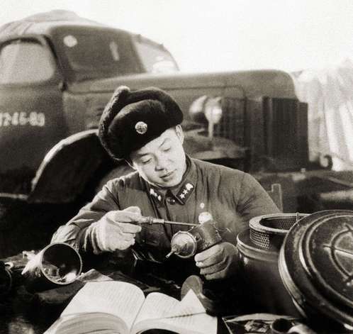 这是雷锋(左三)向战友传授安全行车和节油的经验(资料照片)。新华社发
