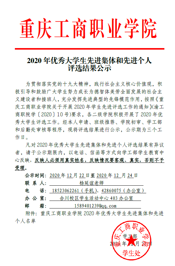 重庆工商职业学院2020年优秀大学生先进集体和先进个人评选结果公示