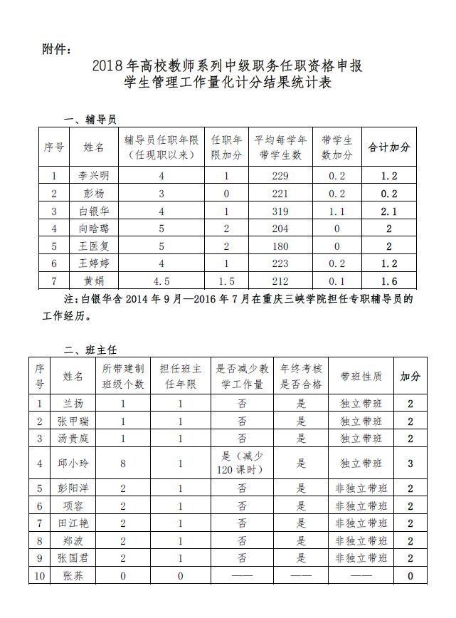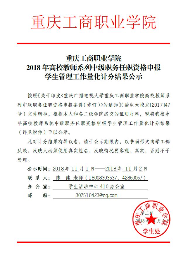 重庆工商职业学院2018年高校教师系列中级职务任职资格申报学生管理工作量化计分结果公示