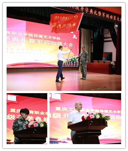 传媒艺术学院2018级新生军训动员大会上,新生代表影视动画专业杨婧怡同学的发言,代表着全体新生完成军训的决心和信心;学院党总支书记陈崇刚书记传达了学院全体教师对新生军训的殷切希望;院长徐江为苏斌少校授旗,挥舞的红旗在《我是中国军人》的视频中飘扬,代表军训团六营的军训任务就此拉开了帷幕。