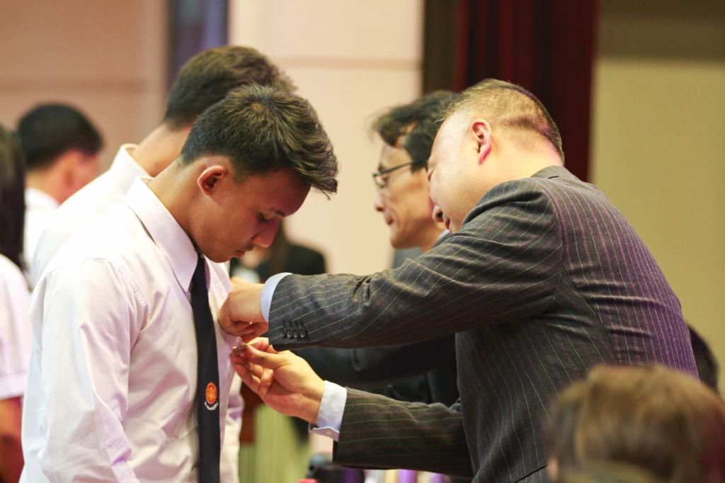 开学典礼上,党委书记郭庆教授、校长李国教授为泰国留学生代表佩戴了重庆工商职业学院校徽。