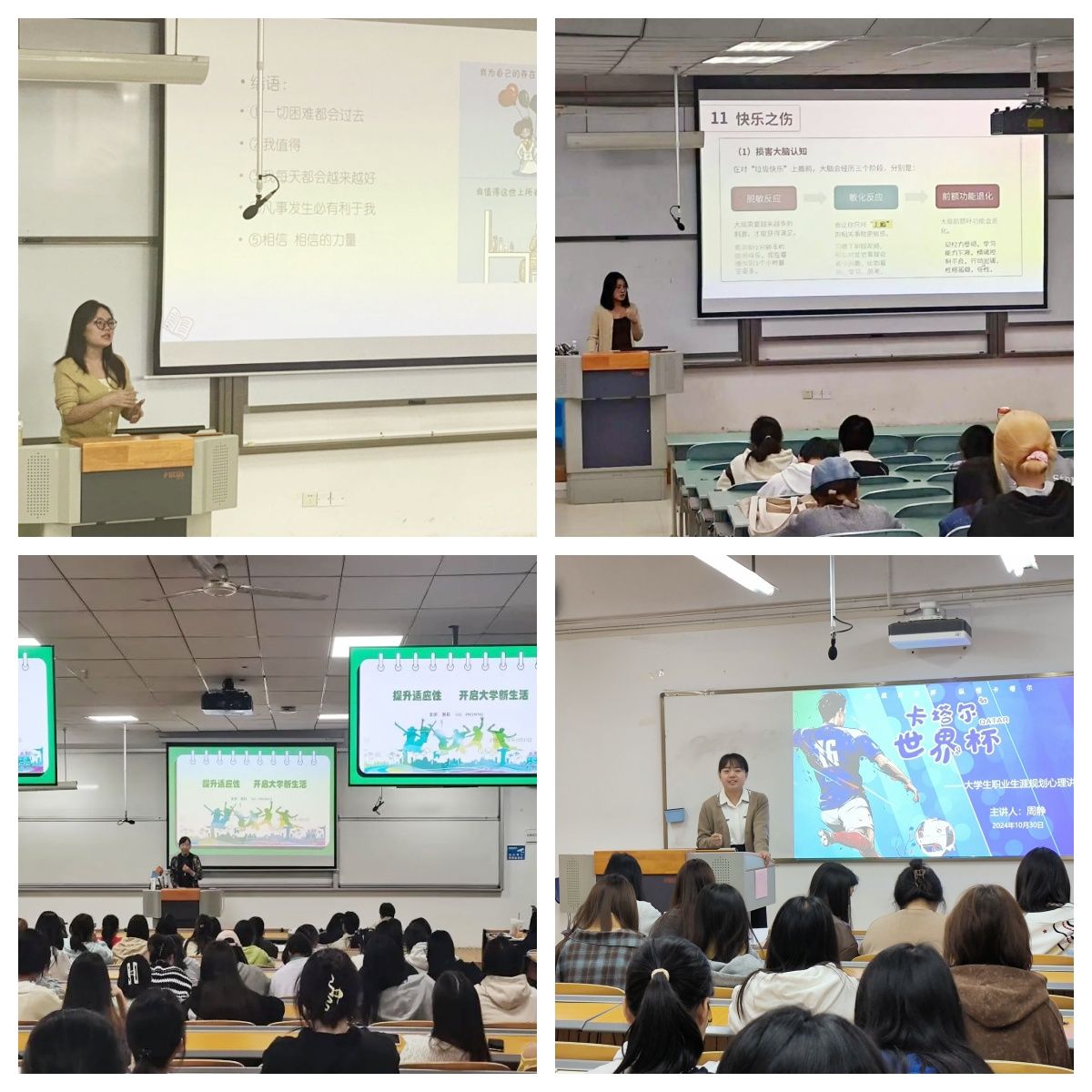 活动简介:10月,学校心理中心开展了“开学心理适应”“克服开学综合征”“开启大学新生活”“职业生涯规划心理”等多场心理健康主题讲座,为学生提供更知心的心理健康知识,引导学生积极投入大学新生活,学会合理调试心理困扰。