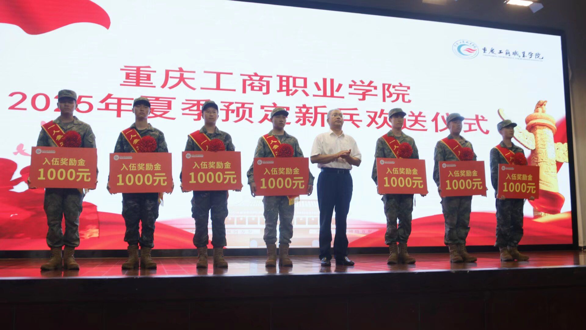 欢送仪式上,刘昌雄为预定新兵代表颁发“参军入伍奖励金”,他勉励同学们在军营里刻苦训练、勤学本领,早日锻炼成为一名优秀战士。