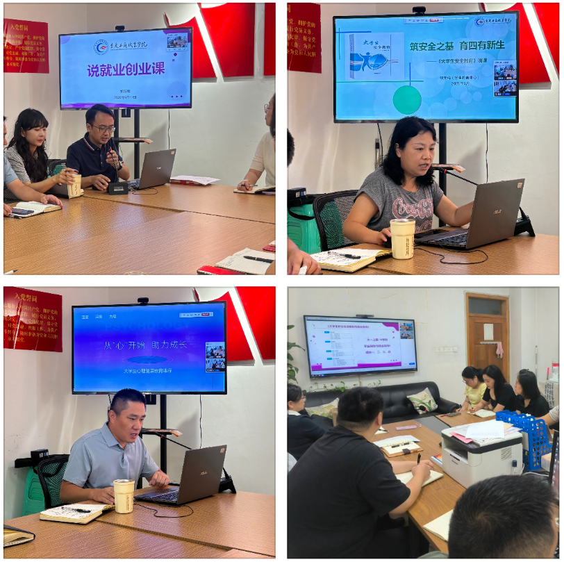 活动中,郑跃军老师围绕《职业规划与就业指导》《大学生创新创业》《职业规划与素质教育》课程,重点从教材使用、教学思路、教学实践等方面进行了讲解;程元梅老师以“筑安全之基,育‘四有’新人”为主题,讲解了《大学生安全教育》课程的定位、内容模块与实施路径;谢德光老师则以“从‘心’开始,助力成长”为题,系统讲解了《大学生心理健康教育》课程的建设与创新。三位责任教师的讲解涵盖课程的性质与定位、目标与内容、教学方法与策略、课程思政、课程资源、教学评价、特色亮点等多方面的内容。此次活动不仅是对公共基础课程建设情况的一次集中展示,更是学工部推动“三全育人”、深化课程改革的重要举措。