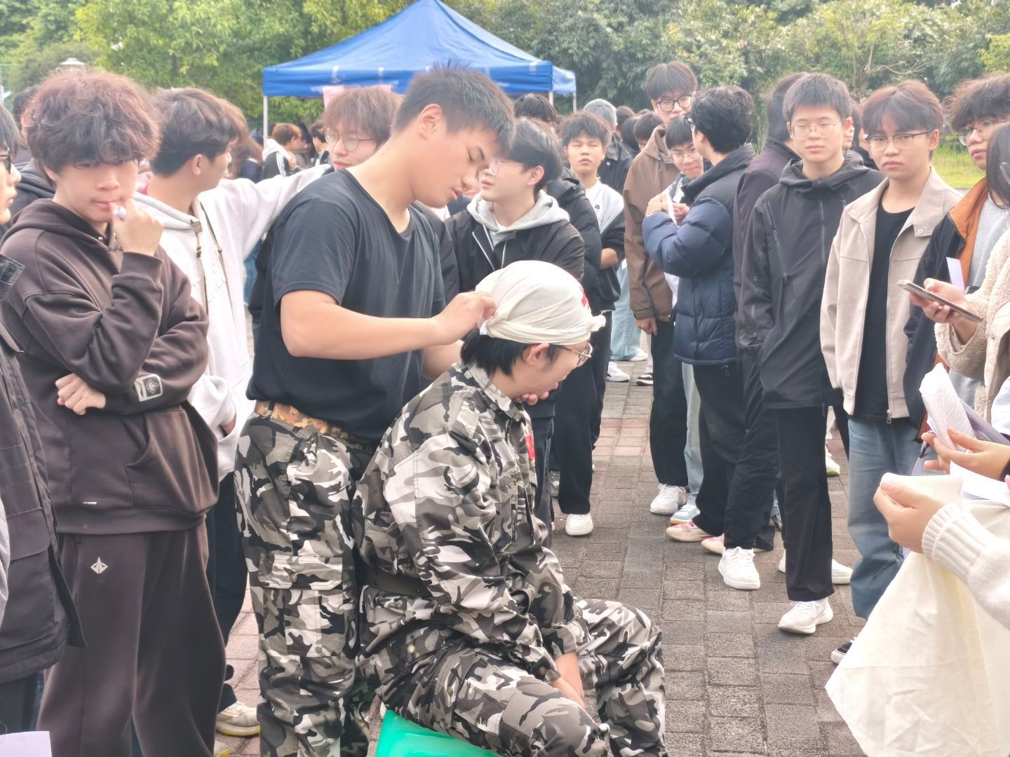 活动现场设置了军营物资展示、军事理论答题、军旅活动体验等特色打卡项目,各点位工作人员细致指导,学生们热情高涨,在近距离观察军事装备、扫码回答军事知识、模拟手榴弹投掷、学习叠“豆腐块”军被、战场救护和低姿匍匐体验等项目中,沉浸式感受军旅生活,锤炼军事技能。