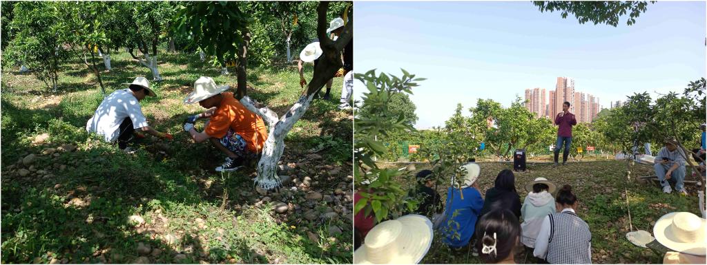 劳动课程开设在校园内的柑橘林中,4月主要学习栽种、施肥浇水、除草除虫等果树的养护知识,让学生在课堂中亲近自然,感受劳动过程,期待劳动成果。