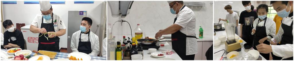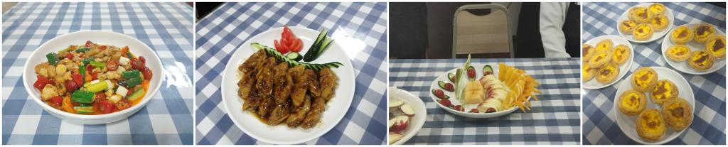 美食课堂开设有烹饪和烘焙两类课程,4月的烹饪课,同学们学习制作了可乐鸡翅、宫爆鸡丁、香姑娃娃菜和水果拼盘;烘焙课学习了杨枝甘露、毛巾卷蛋糕和葡式蛋挞的制作方法。