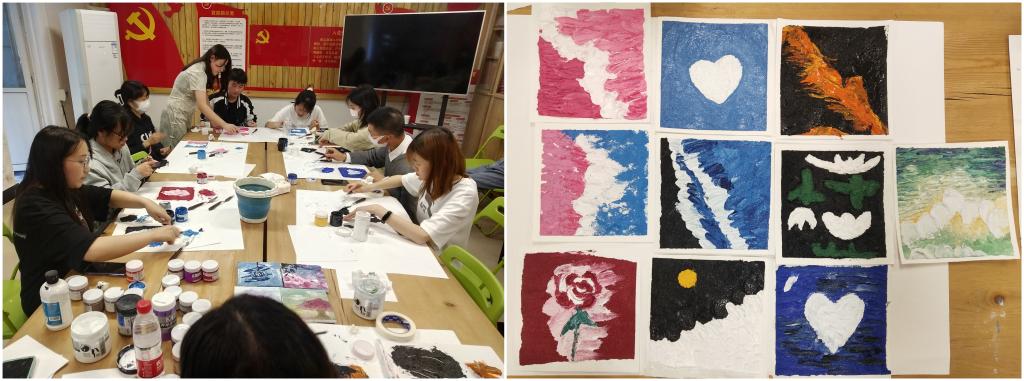石英砂画课中老师带领学生用石英砂石调入颜料,做出立体的图画。