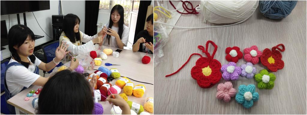 老师传授勾线技巧,制作出朵朵可爱的毛线花朵胸针。