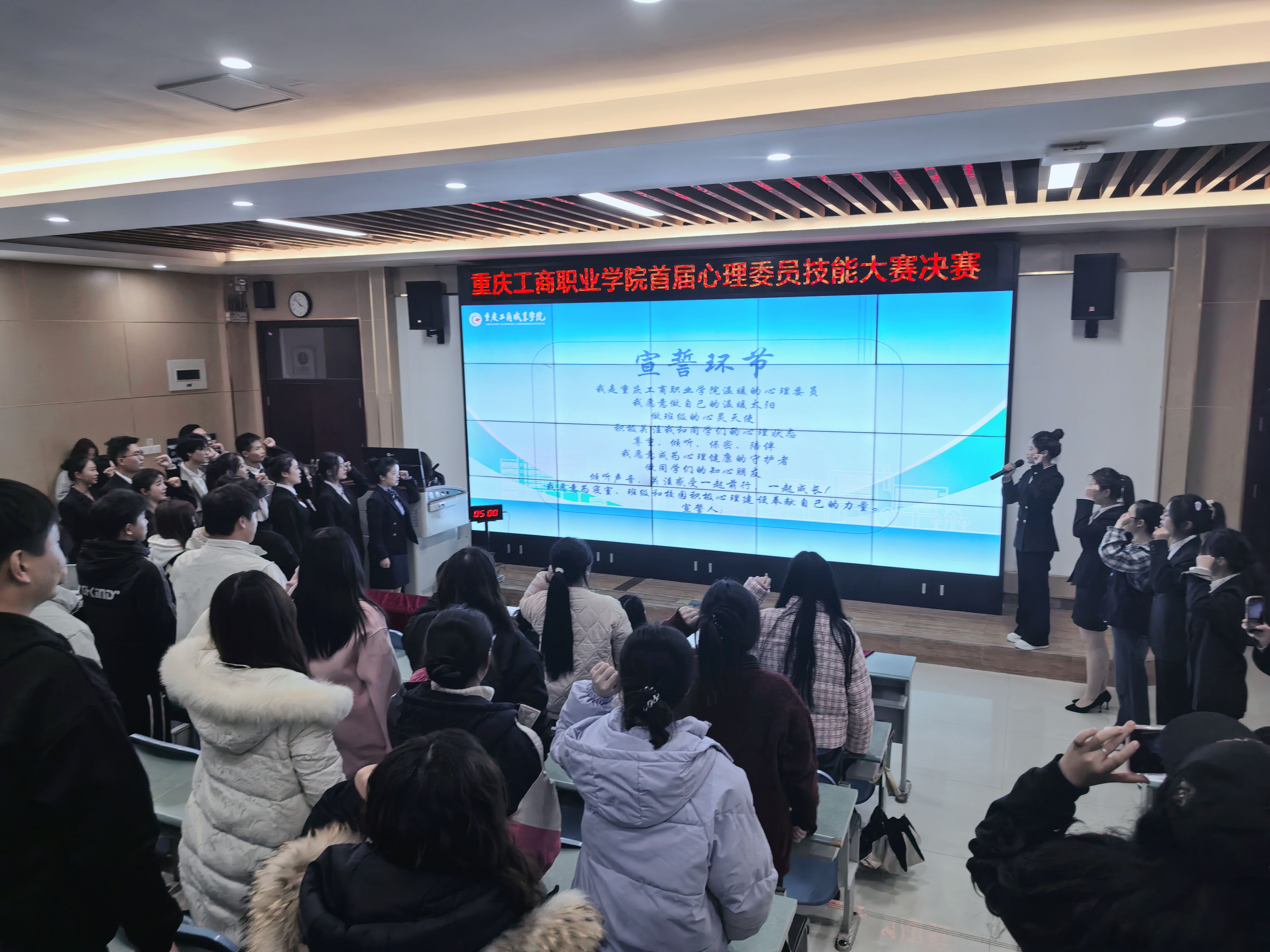 本次心理委员技能大赛分为基础知识测试初赛和心理健康宣讲决赛两个阶段,入围决赛的18名班级心理委员围绕情绪管理、恋爱情感、生命教育、挫折应对等主题进行了精彩宣讲展示。“我愿意成为心理健康的守护者,为寝室、班级和校园的心理建设奉献自己的力量”,活动现场150余名心理委员进行了心理委员的宣誓仪式。